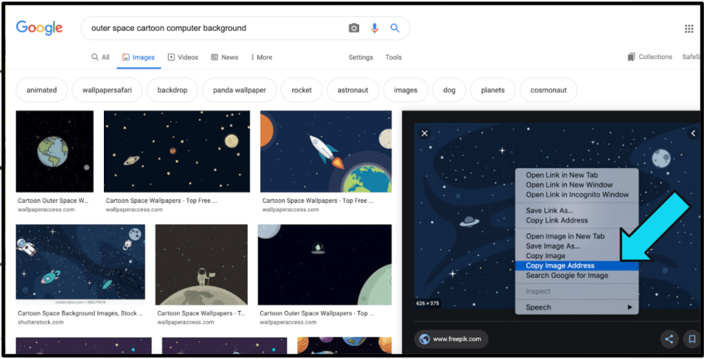 The first thing you need to do is find a picture that you want to use as your background. For example, if your teaching a lesson on planets, you might want the background to be picture of the solar system. Right click on the image and click ‘copy image address.’