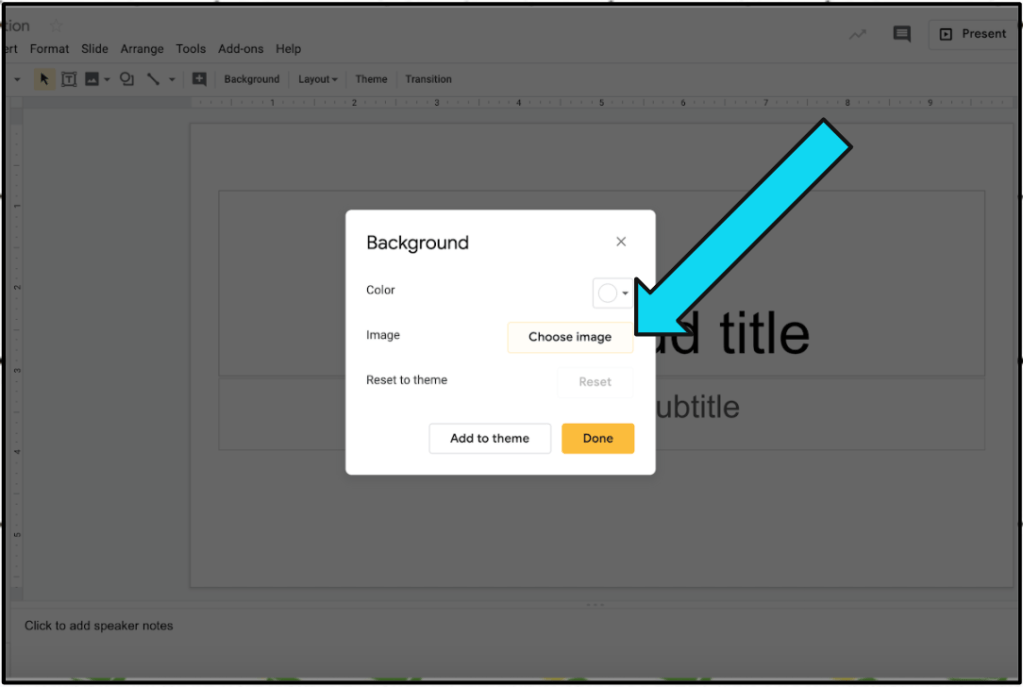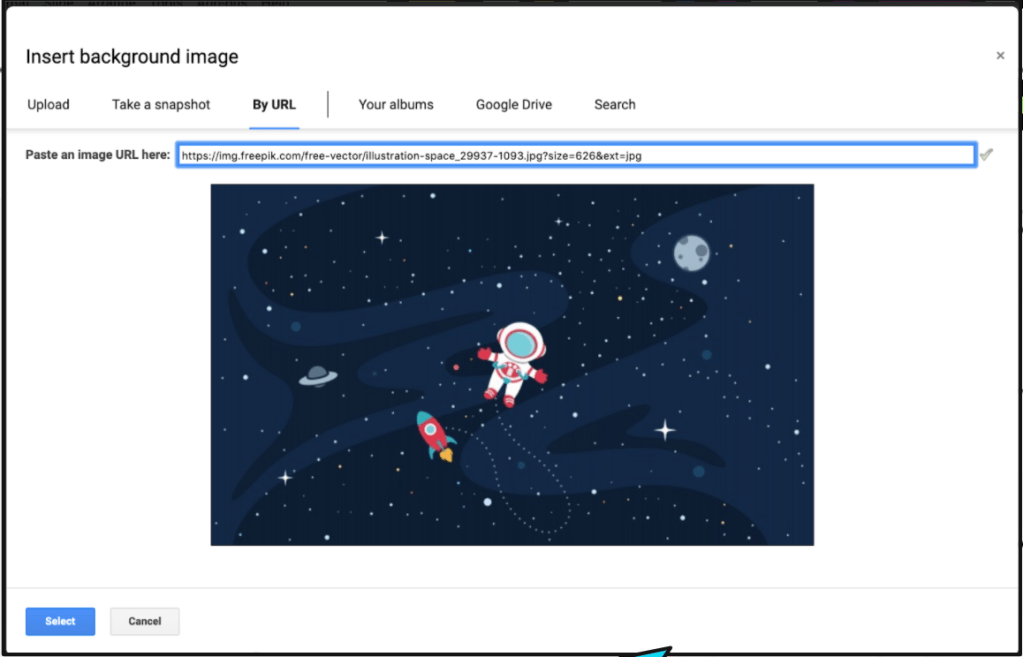 Then, go back to your presentation and click on ‘background in the top toolbar. Click on ‘choose image’ and import the background by copying the URL into ‘by URL’. Click ‘select’ and ‘done’.