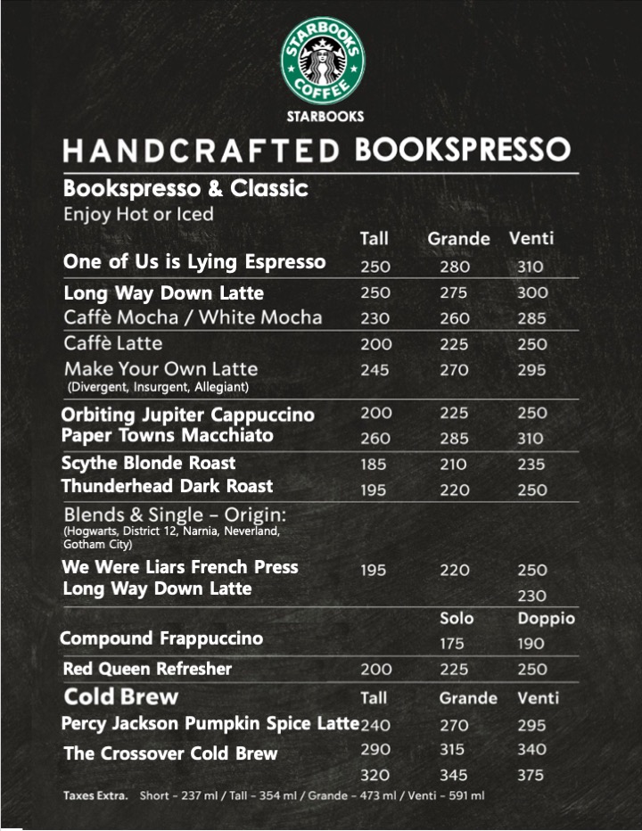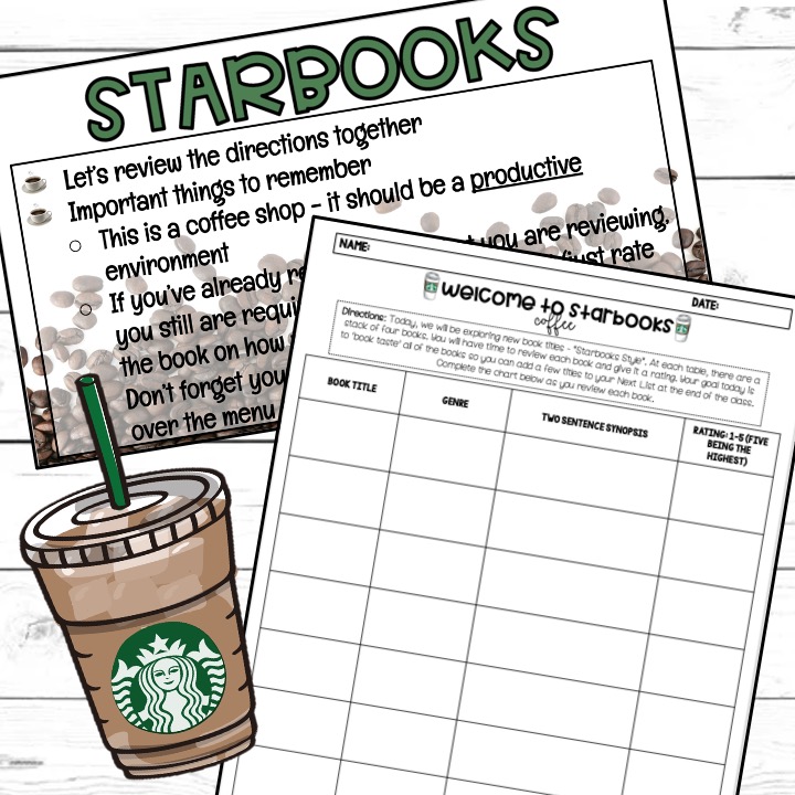Once your directions and handouts are ready, you can start working on the fun stuff. This is all about the environment. What do you want it to feel like? Sound like? Smell like? I had a vision of students ordering their favorite ‘Starbooks’ drink off of a menu and I wanted the menu to reflect some of our favorite books + the ones that were on the tables for them to preview. I started recreating a menu to fit our ELA lesson by mocking what an actual Starbucks menu looks like. I added in the sizes and made sure that the book titles had a play-on-words from popular menu items. (This can seem like a lot of work to do – it is also included in my TPT product which is editable)